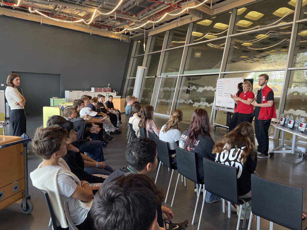 Zudem nahmen die Schüler:innen an einem Workshop zur Energieumwandlung teil, in dem dieses Thema in sehr anschaulichen kleinen Experimenten praktisch nachvollzogen werden konnte. So wurde beispielsweise aus Batterie, Magnet, Draht und einer Schraube ein kleiner Elektromotor gebastelt und welche Gruppe schafft es, eine Flasche Wasser ohne Hilfsmittel am stärksten zu erwärmen?