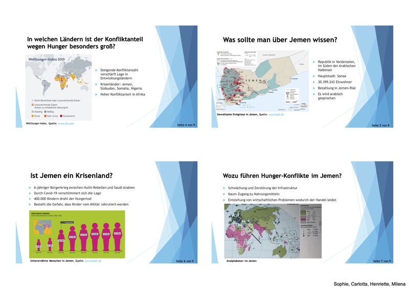 In der 7. Klasse (2021) erstellten die Schüler*innen Grafiz zum Thema Leben in Risikoräumen und ein Jahr später der 8. Klasse (2022) eine Präsentation zum Thema Hunger - seine Ursachen und Auswirkungen.