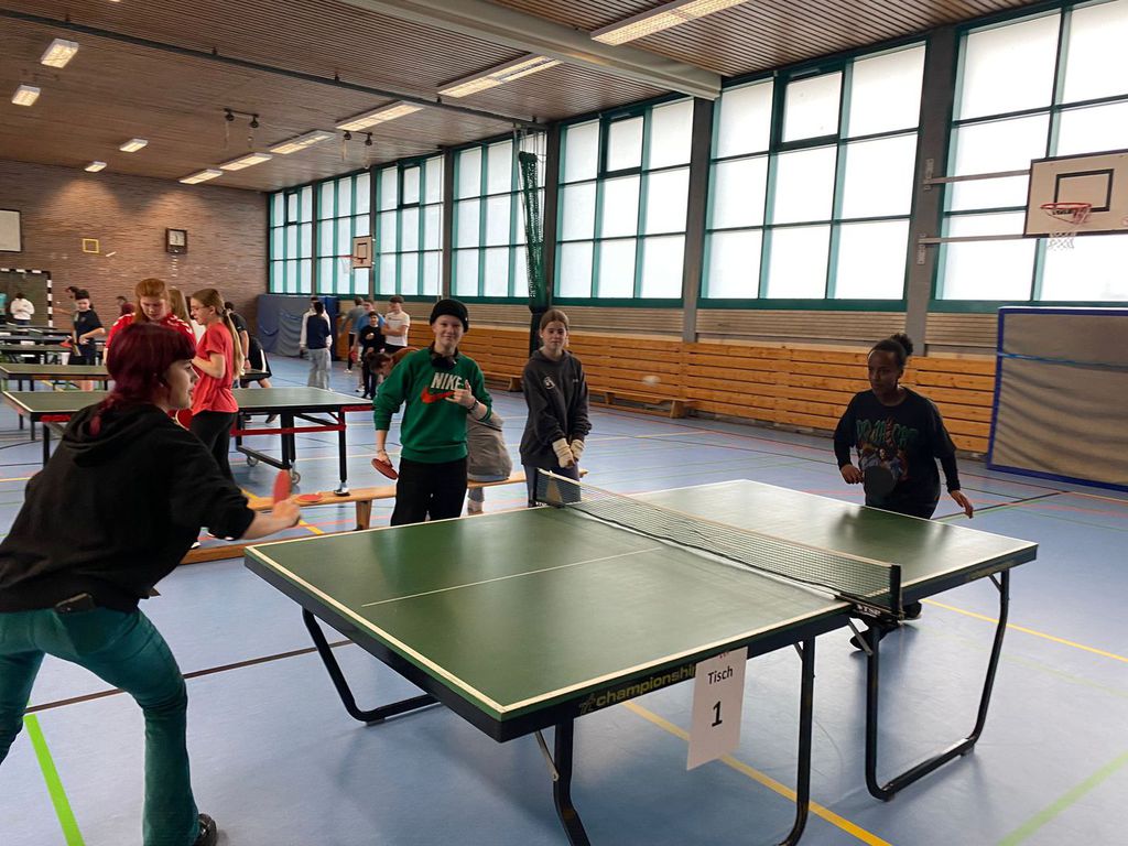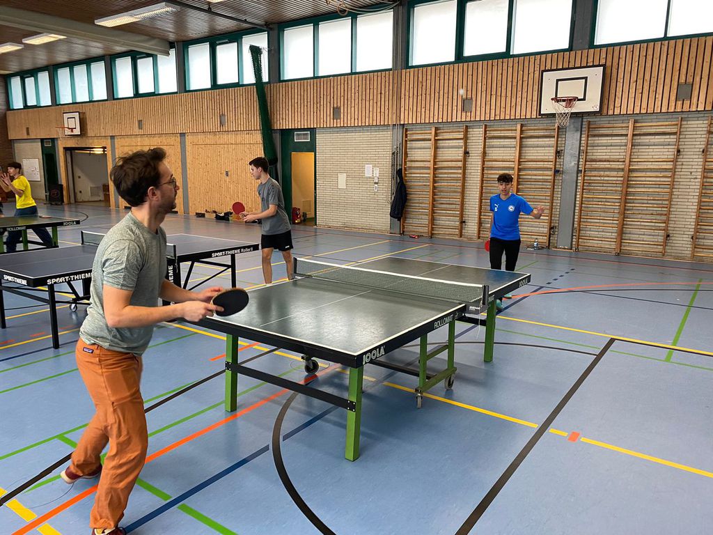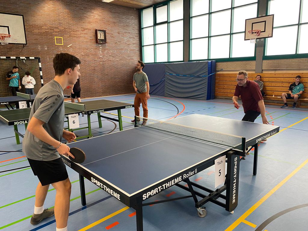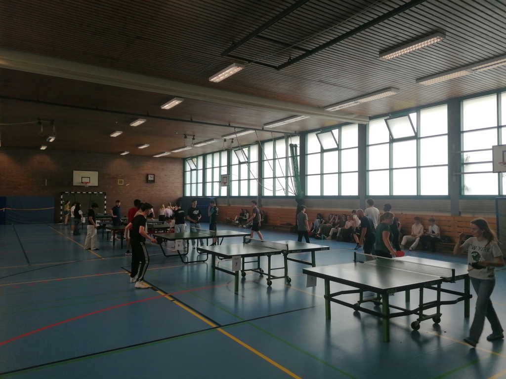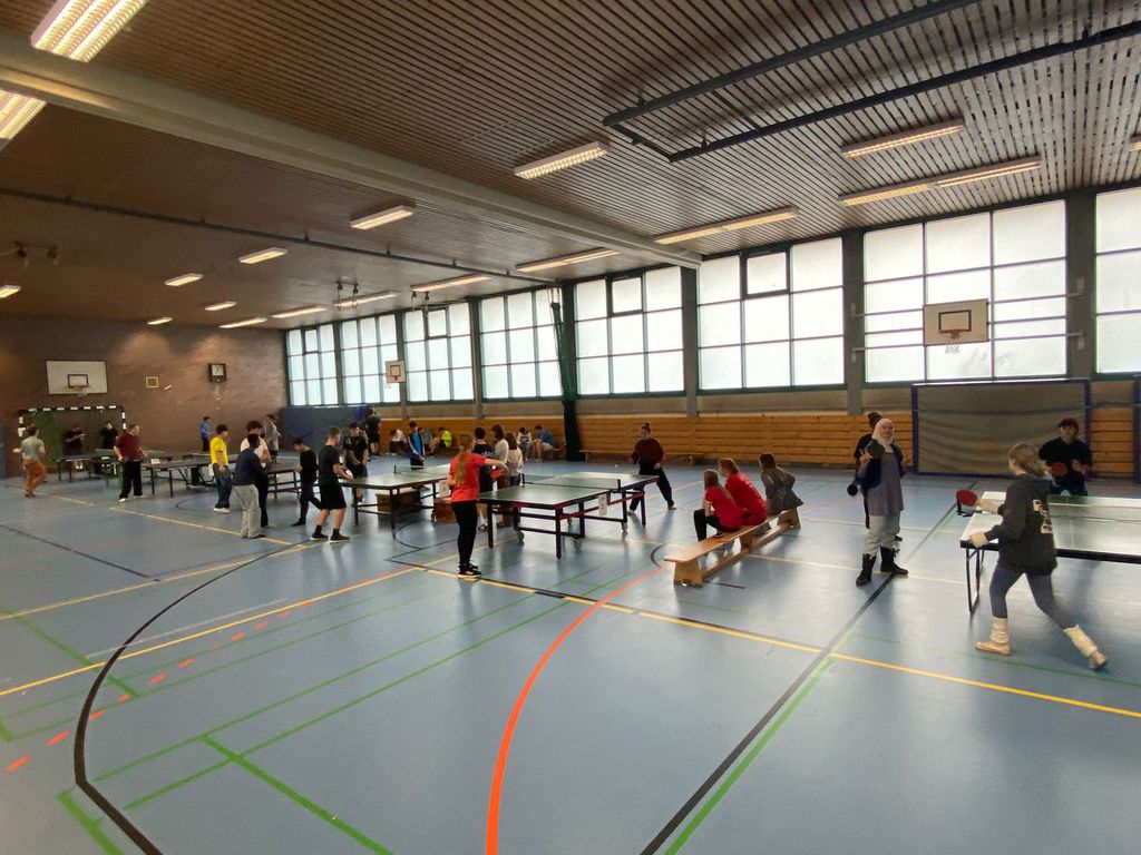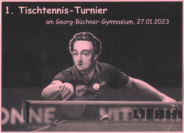 Das Tischtennisturnier am Georg-Büchner-Gymnasium erfreut sich wachsender Beliebtheit: 35 Teilnehmer/-innen an 8 Platten kreuzten ihre Schläger, die in etlichen Fällen die Schule ihnen dazu lieh. Auch einige Lehrer/-innen und Frau Mai, unsere Schulsekretärin, waren mit von der Partie und scheuten den Vergleich mit den „jungen Hüpfern“ nicht.